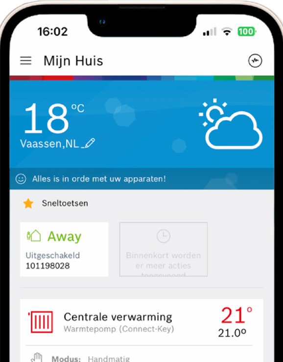 Bediening gaat moeiteloos via het nieuwste touchscreen kleurendisplay op de binnenunit van de warmtepomp. Of met de intuïtieve HomeCom Easy App op uw smartphone. Daarnaast kunt u ook kiezen voor een van de bijpassende kamerthermostaten.